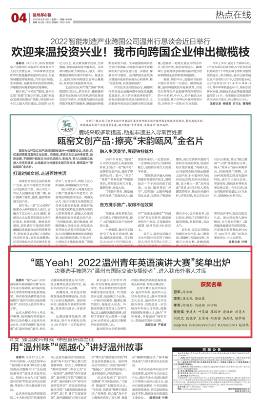 的老师陈亦挺获得冠军,所有参加决赛的选手还被聘为“温州市国际交流传播使者”,同时进入我市外事人才库。