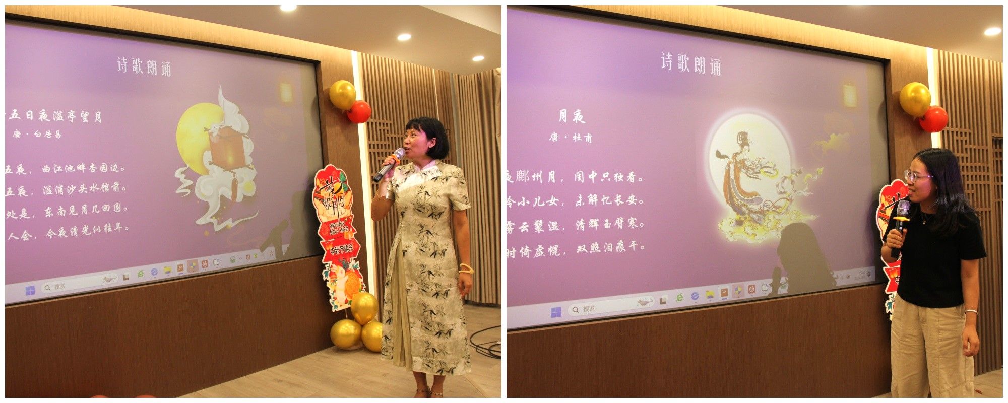紧接着,抖阴 举行了“幸福外国语,共享团圆心”中秋节活动。抖阴 工会委员余嫦嫦向在座的老师介绍了中秋节的历史渊源与风俗习惯,并邀请英语外教Christine和David共同参与中秋知识竞赛和诗歌朗诵。教师们纷纷登台,用真挚的情感朗诵了《八月十五日夜湓亭望月》、《望月怀远》等以经典诗词,现场充满了欢声笑语,其乐融融。