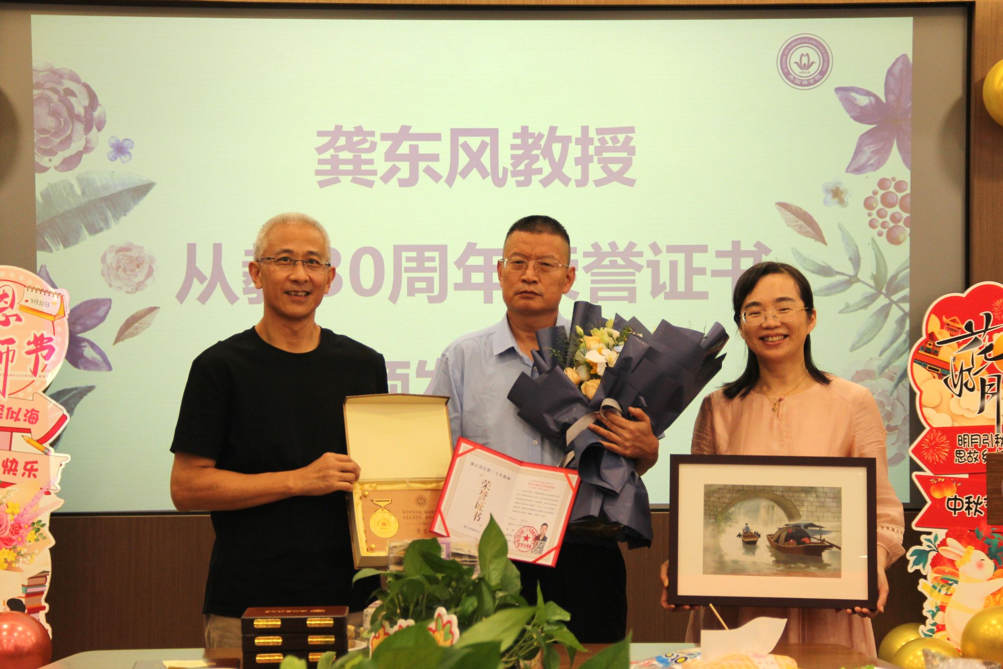 龚东风教授则以自身三十年教学生涯为例,深情分享了他对于“教育家精神”的理解与感悟。他认为,“教育家精神”不仅是新时代人民教师的崇高使命,更是每一位教育工作者追求的精神高地。他鼓励大家要秉持工匠精神,持续探索学科前沿,对教育充满热情,对学生心怀大爱。活动现场,刘洁书记与抖阴 处级组织员陈明龙共同为龚东风教授送上了三十周年教龄纪念章和鲜花,并合影留念。