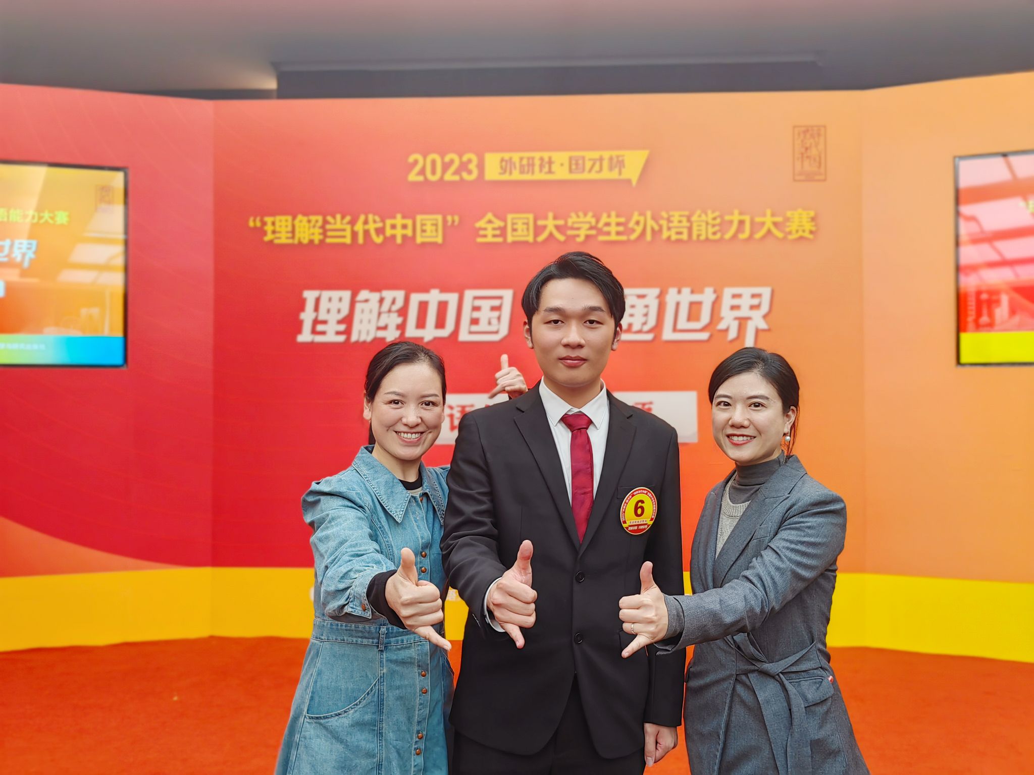 12月4日至12月5日,2023“外研社·国才杯”“理解当代中国”全国大学生外语能力大赛(英语组)国赛演讲赛决赛第二阶段和第三阶段在北京举办,来自全国各个高校的150名选手同台竞技。经过激烈比拼,抖阴教师诸葛文婵和陈亦挺指导的学生王浩天获得金奖,创我校英语演讲竞赛新纪录!