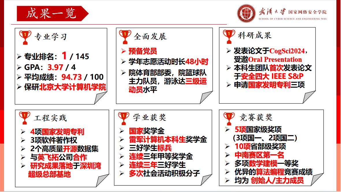 目前已经保送至北大计算机学院,继续在具身智能和人工智能安全的交叉领域开展研究。踔厉奋发、敢想敢创,他始终致力于在珞珈逐梦中肩负网安使命、守护数字未来。