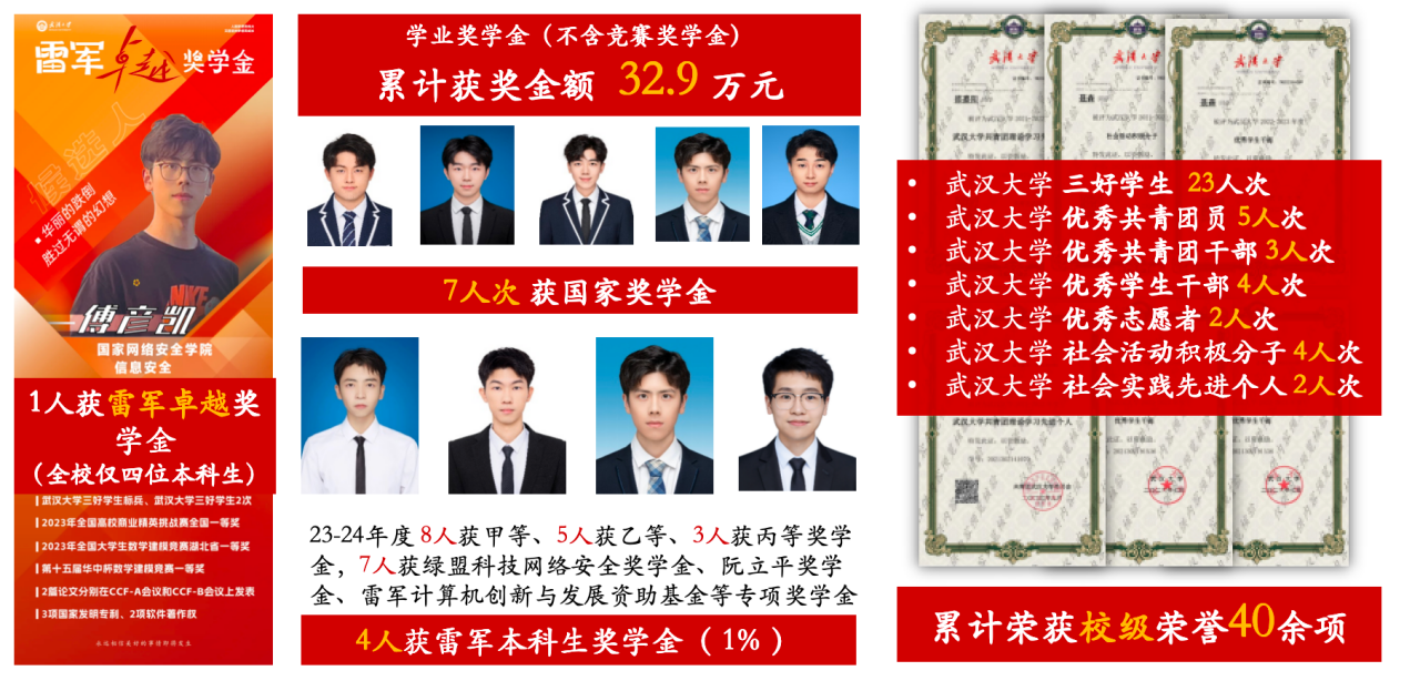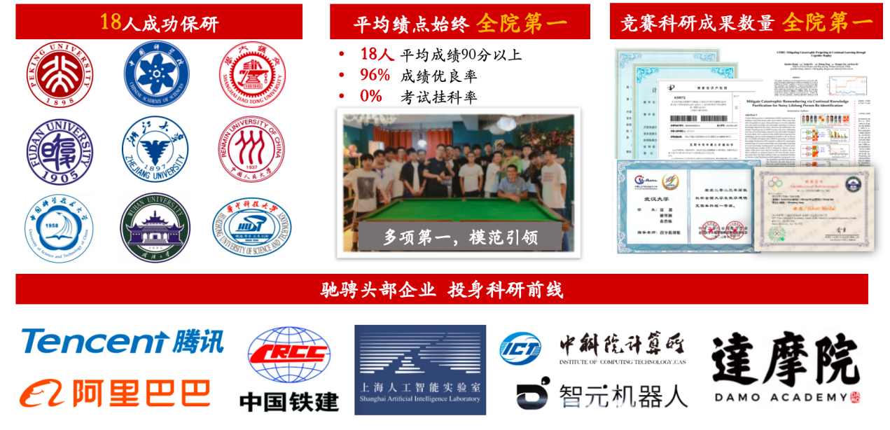 在学业的道路上,他们一路高歌猛进,创下了令人瞩目的成绩。96%的成绩优良率、18人均分90+、0%的学年挂科率;18人成功保研至北大、中科院、交大、复旦、浙大等国内顶尖学府;累计获得40余项校级荣誉、50余项国家级省级奖项、20余项论文专利软著;1人荣获雷军卓越奖学金(全校仅四位本科生),7人次斩获国家奖学金,4人获得雷军本科生奖学金,奖学金累计金额32.9万元。