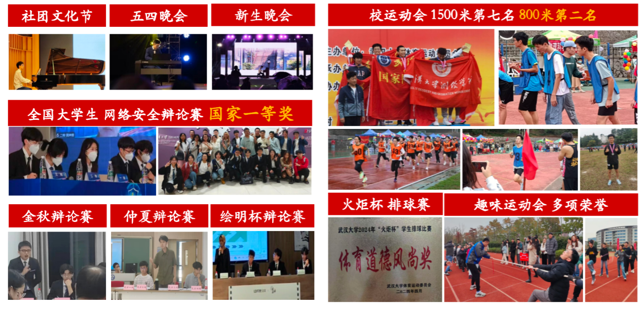 十佳歌手、五四班级合唱、金秋艺术节合唱,到校外的武汉各大livehouse、园博园演出,他们用美妙的歌声唱响青春旋律;辩论场上,他们凭借出色的口才,在金秋、仲夏、绘明辩论赛中屡创佳绩,更在全国辩论赛中勇夺国家一等奖,为学校争得荣誉;运动场上,他们身姿矫健,在校运动会、校趣味运动会、火炬杯等赛事中取得优异成绩,用汗水诠释着青春的拼搏精神。
