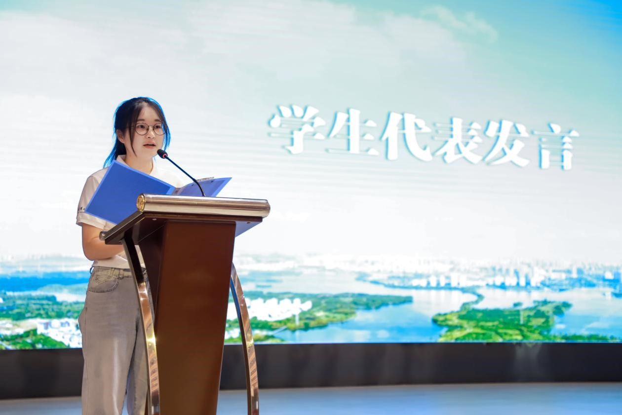 2022级本科生朱思作为学生代表发言。她代表本次参与政务见习的同学们对东西湖区和学校提供本次发展锻炼的机会表示感谢,并向参与本次政务见习的同学发出三点倡议:珍惜实践机会,锤炼过硬本领;恪守纪律要求,展现良好面貌;牢记使命担当,勇做时代新人。