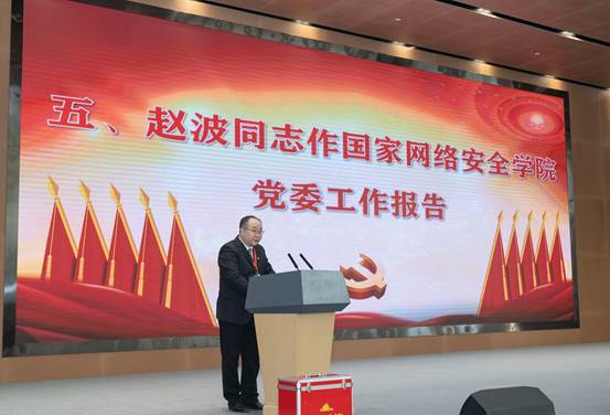 赵波代表学院党委向大会作了题为《立地顶天 内聚外联 奋进全面建设一流网络安全学院新征程》的报告,本次大会的主题和任务是:高举中国特色社会主义伟大旗帜,全面贯彻习近平新时代中国特色社会主义思想,认真学习宣传贯彻党的二十大精神,深入贯彻落实习近平总书记关于网络强国的重要思想,在学校党委、行政坚强领导下,坚持“立地顶天、内聚外联”发展战略,总结经验、凝聚共识,居安思危,守正创新,为全面建设一流网络安全学院而团结奋斗。赵波指出,本次大会是抖阴