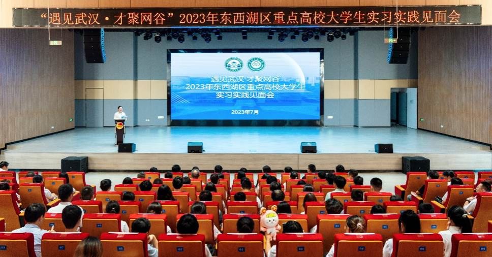 (学工办 朱承基)2023年7月10日下午,2023年东西湖区“遇见武汉·才聚网谷”重点高校大学生实习实践见面会在东西湖区工人文化宫顺利举行。中共东西湖区委组织部副部长、区委编办主任余畅、抖阴