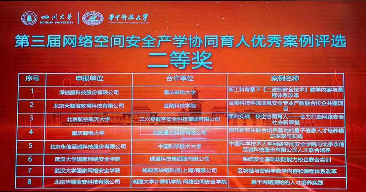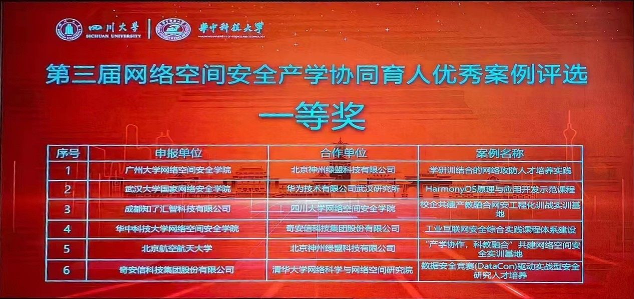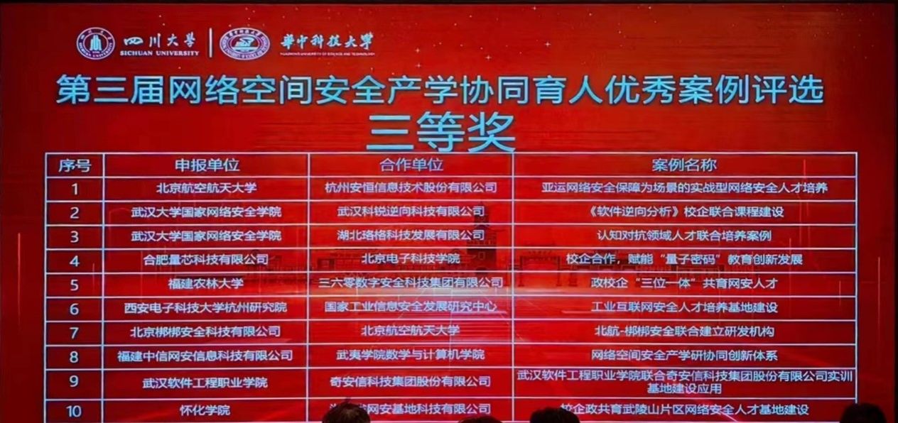(实验教学中心 杜秋平 熊翘楚)2023年7月6日,由教育部高等学校网络空间安全专业教学指导委员会产学合作育人工作组主办、四川大学与华中科技大学共同承办的“第三届网络空间安全产学协同育人优秀案例评选会”在四川成都召开线下评审会,抖阴