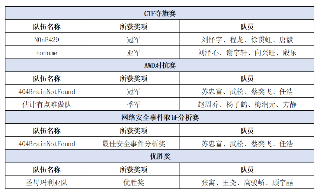 二年级本科同学组建,他们在面对高年级本科生及研究生战队时表现优异,最终获得CTF夺旗赛亚军。获奖情况具体如下: