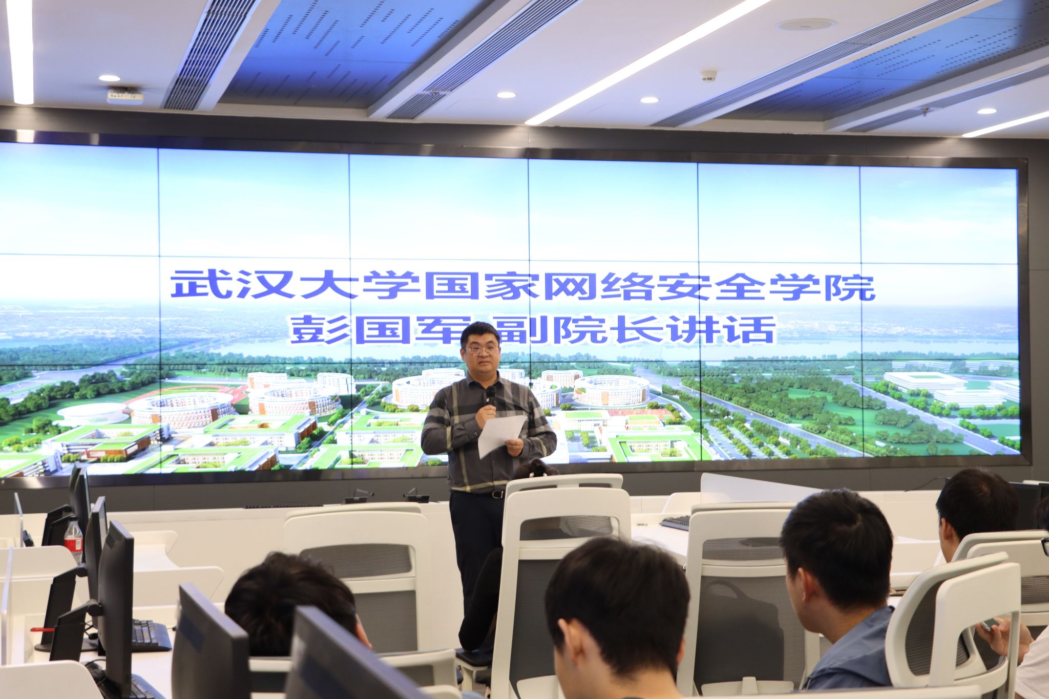 彭国军副院长发表讲话,他表示,本次比赛全方位展现了两校战队的风采和实力,同时这也是对我们两家学院大学生创新实践能力培养工作的一次有效检验!同学们在本次比赛中相互学习交流和促进,同时也体会到挑战自我、突破自我的乐趣和激情。本次“同园双星”友谊赛是两所国家一流网络安全学院共同合作推进网安人才培养的重要举措,迈出了两校共建国家网络安全与创新基地和国家一流网络安全学院的重要一步,后续武大、华科将继续携手,在课程、师资、实习实训平台、活动资源等各方面进一步加强合作共享,共同推进网络安全人才培养工作。