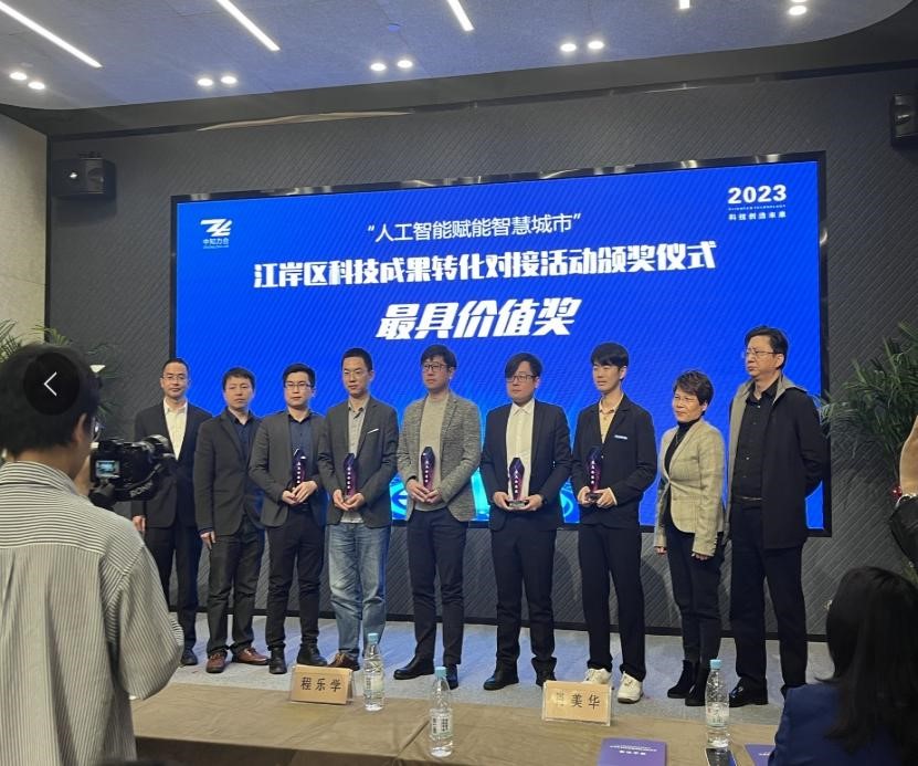 曹越教授代表学院参加了武汉市江岸区科技成果转化对接活动。曹越老师依托于联合武汉深捷科技股份有限公司共同获批的武汉市2022年重点研发计划项目“智能网联静态泊车技术研发”,获“人工智能赋能智慧城市”最具价值奖。