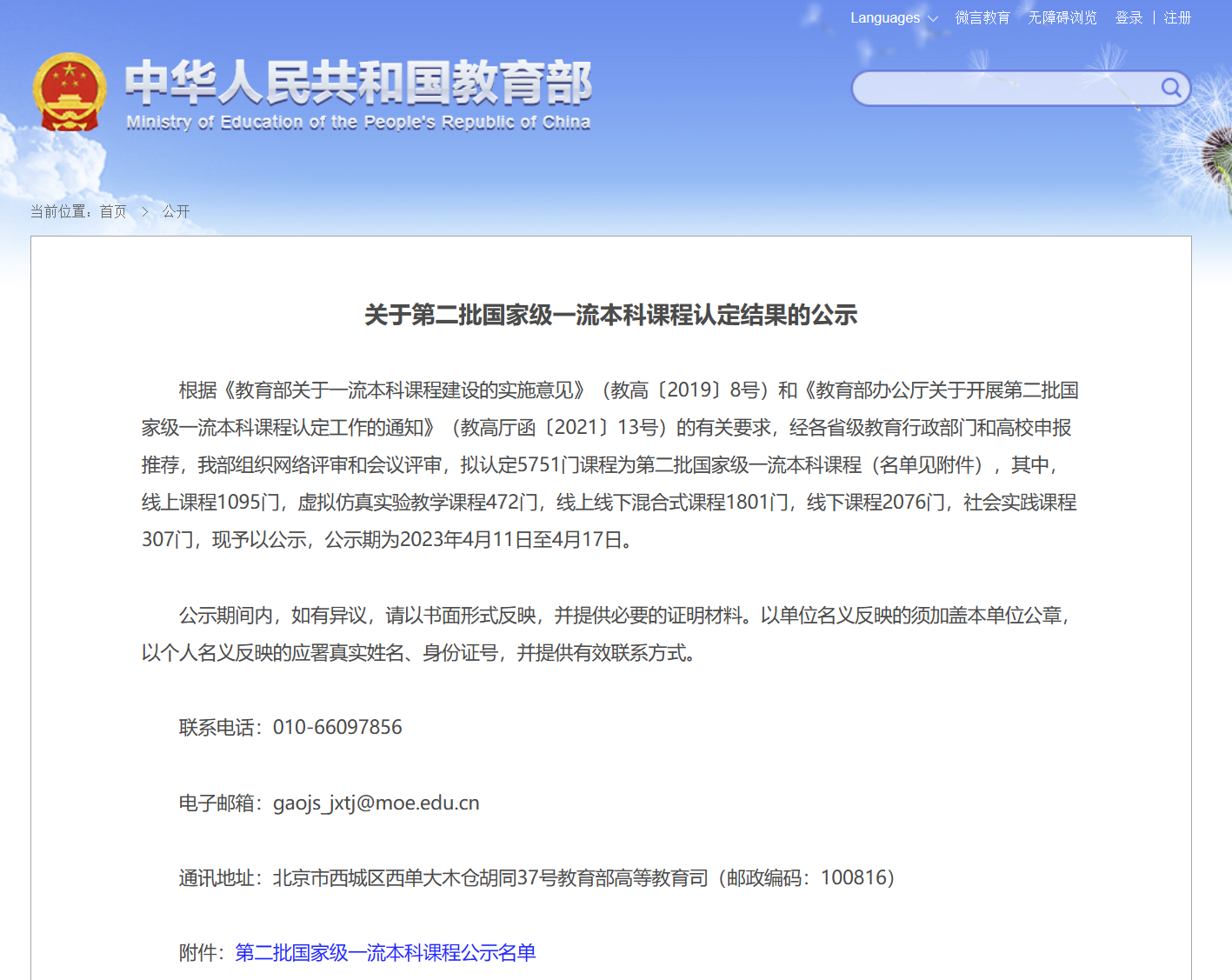 教育部关于第二批国家级一流本科课程认定结果的公示