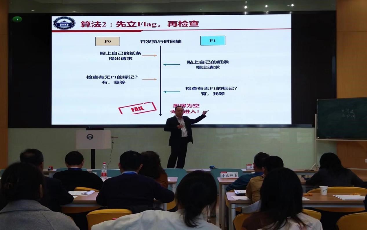 现场比赛中,赵磊老师准备充分,通过提出生活中公共空间有效使用问题,从算法角度,将复杂的“软件实现的互斥算法”,一步一步从三个错误算法引出第四个正确算法,进行了生动而又深入浅出的讲解。