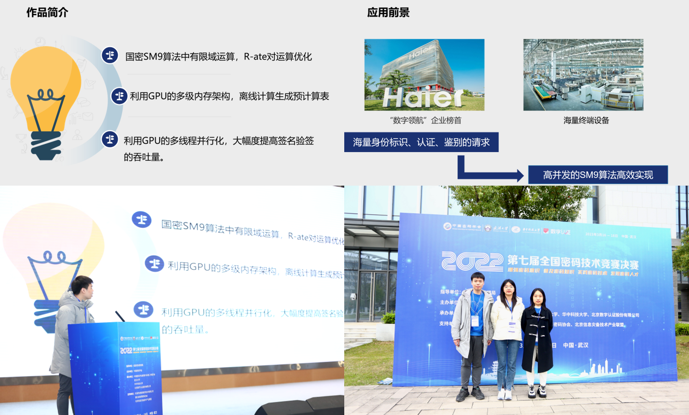 作品《基于并发架构的SM9算法高速实现》,利用CUDA编程模型优化数字签名认证的速度和效率。该技术方案具有高吞吐量、低延时、高可扩展性的特点,优化后CPU测试的数字签名验证速度比现有方案快了1400倍左右。项目方案适用于高并发签名的使用场景,如在互联网的交互活动中,数字签名验证速度越快,“秒杀”或是“抢票”的成功率就越高。