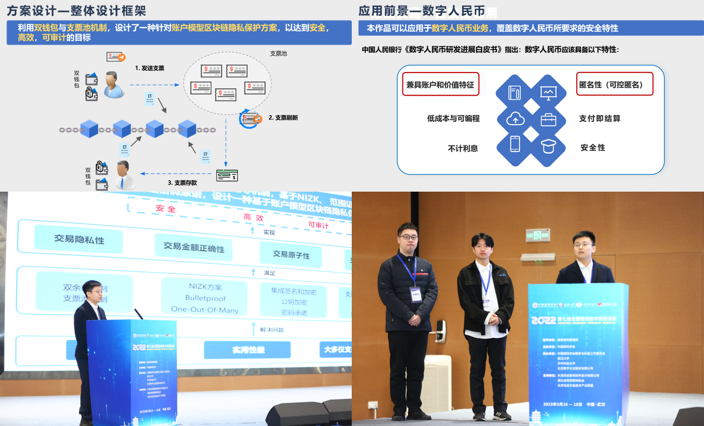作品《基于NIZK的账户模型区块链隐私保护方案》,提出了一种高效的基于非交互式零知识证明的隐私保护方案。目前存在的区块链隐私保护方案,大多面向UTXO模型设计,不适用于基于账户模型的区块链。本项目的亮点在于设计了“支票池”机制来切断交易发起方与接收方之间的联系,发送方以支票的形式进行转账,接收方从支票池中刷新支票,而不暴露原始的支票,为区块链隐私保护提供了新思路。