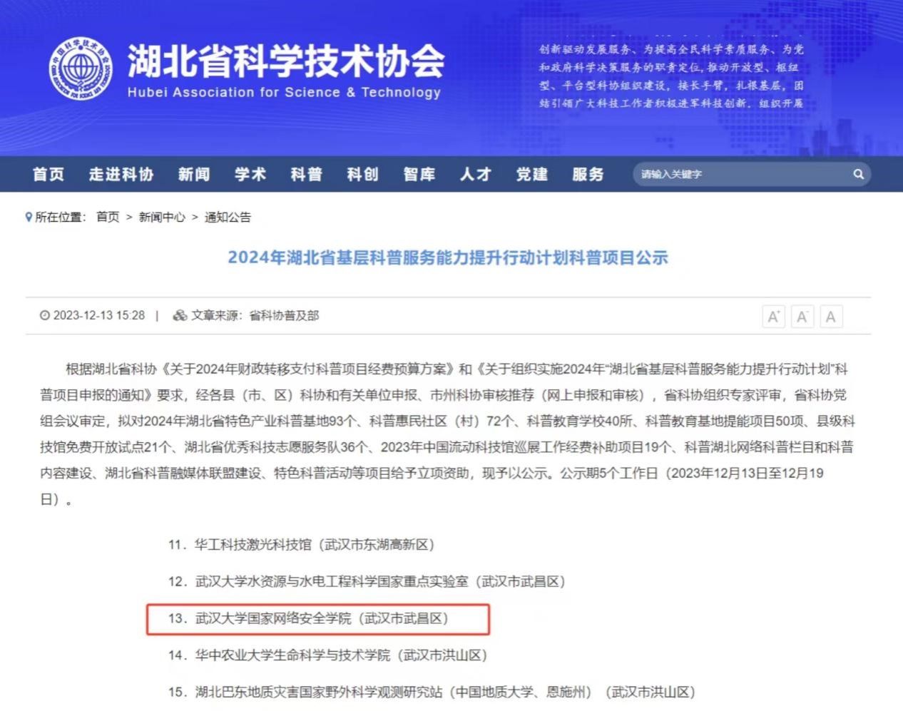 《网络安全知识科普教育基地建设与提能》项目入选湖北省科普教育基地提能项目。