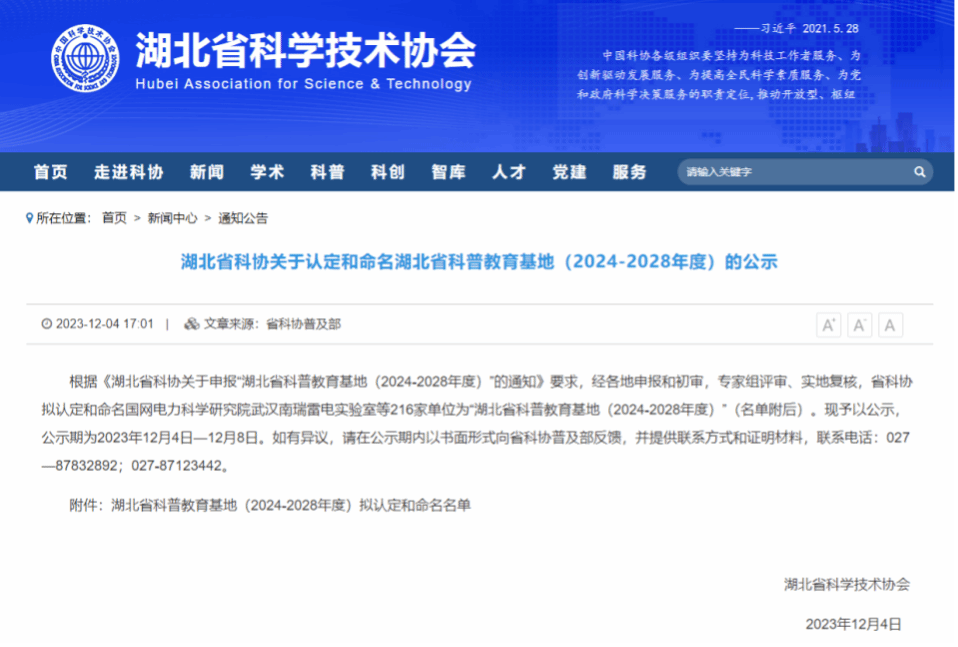 (通讯员 文贝西) 近日,湖北省科学技术协会发布关于认定和命名湖北省科普教育基地(2024-2028年度)的公示名单,抖阴