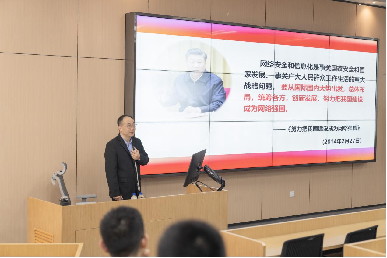 学院党委书记赵波教授作网络强国思想专题报告,他以网安专业的定位为出发点,分析了当前我国网信技术瓶颈和信息技术进步给网络安全带来的挑战,介绍了建设网络强国的时代背景,详细深入地讲解了网络强国战略的部署与实践。他强调,要深刻理解加强党对网信工作的集中统一领导、加强网络基础设施建设、增强自主创新能力、全面发展数字经济、提高网络安全保障能力、推进网络与社会治理、提升网络空间的国际话语权和规则制定权这几项战略部署的内在逻辑,领会网络安全对政治、经济、文化、社会、生态、国防等关键领域的重要意义。最后,赵波教授勉励参训学员,网安青年应该树立正确的网络安全观,不断提升网络安全意识,严守网络法律底线,具备网络风险防范能力,大力弘扬社会主义主旋律。
