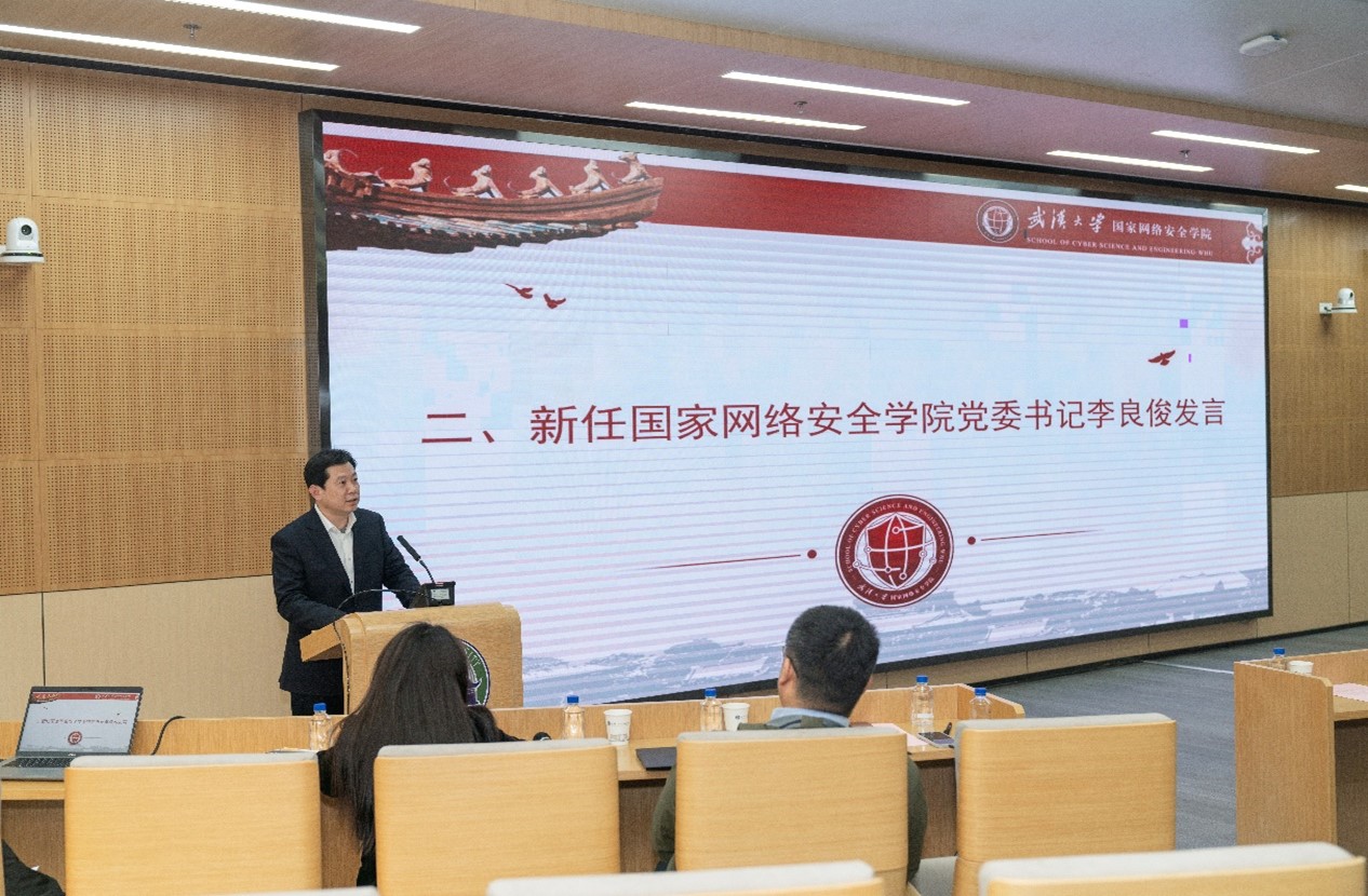 李良俊在发言中表示,坚决服从组织决定,衷心感谢学校党委信任。他表示,在新的岗位上,将加强学习、找准定位,认真学习习近平总书记关于总体国家安全观、网络强国重要论述和指示精神等,深入调研,全面了解学院情况;实干担当、认真履职,履行党建工作主体责任,加强领导班子建设,促进党建与业务工作紧密融合,促进学院高质量发展;守正创新、团结奋进,与班子成员一道,团结凝聚全院师生,充分发挥各方智慧和力量,在建设一流网络安全学院新征程中展现担当、主动作为;走在前列、当好表率,与全院教职工团结共事、一心干事、合力成事,营造风清气正的学院环境。坚决扛起全面从严治党责任,永葆清正廉洁本色操守。他对前任书记赵波同志的付出表达衷心感谢。