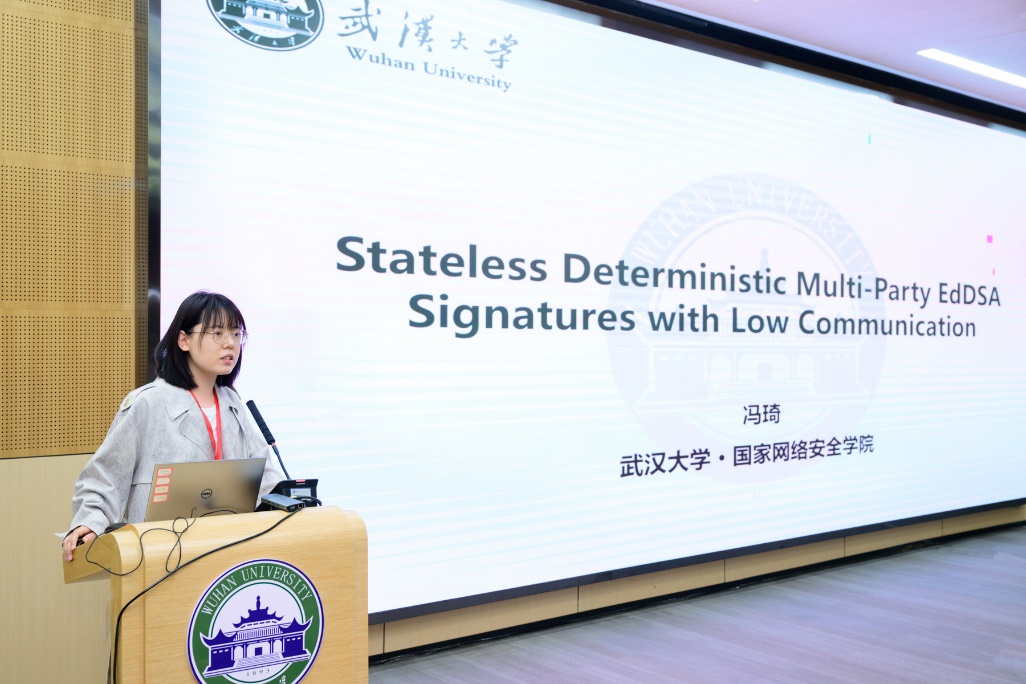 副研究员冯琦提出一种全新的无状态确定性多方门限EdDSA签名协议,采用多验证者场景下的信息论消息认证码(IT-MACs)对数值进行认证。最终协议的通信轮数为常数轮,通信开销降低约56倍。