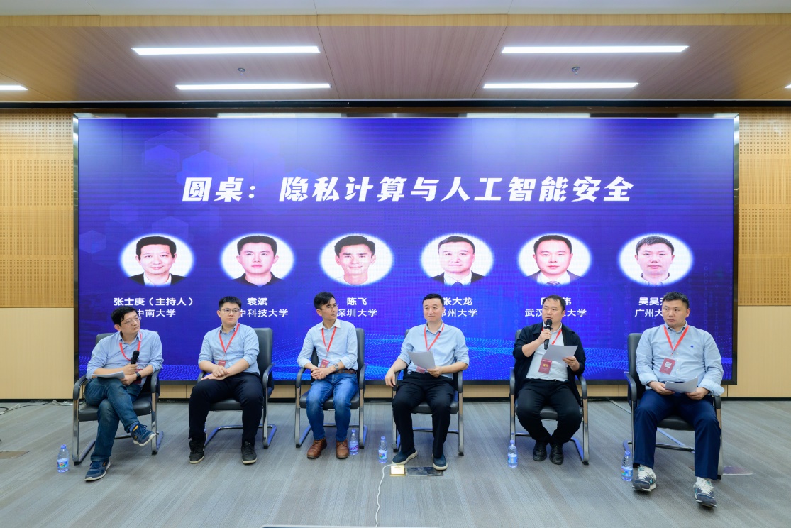 隐私计算与人工智能安全圆桌讨论由中南大学张士庚教授主持。郑州大学张大龙教授、广州大学吴昊天教授、武汉理大学周俊伟教授、深圳大学陈飞教授、华中科技大学袁斌副教授围绕隐私计算技术在应用中效率与安全兼顾问题、大模型的广泛应用是否会进一步加剧数据泄漏风险、基于内生安全原理的大模型安全检测及隐私保护、大模型在软件安全检测/测试方面最新进展、大模型的幻觉问题、构建新的防御体系保证使用AI过程中的安全、加强人工智能的监管和治理等问题展开深入讨论。