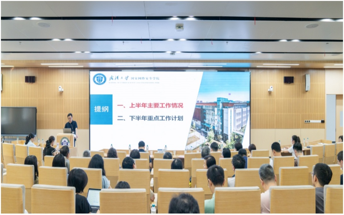 会议第二阶段,由王骞院长代表学院作2025 年上半年工作总结,系统回顾了学院在党建引领、人才培养、师资队伍建设、一流示范项目建设、学科发展、科学研究及治理体系完善等方面取得的成果,并对下一阶段重点任务做出部署。他强调,要坚持以习近平新时代中国特色社会主义思想为指导,紧扣 “建设一流网络安全学院,培养一流网络安全人才”的核心目标,全面落实立德树人根本任务,大力弘扬科学家精神和教育家精神,高质量推进一流网络安全示范项目建设。