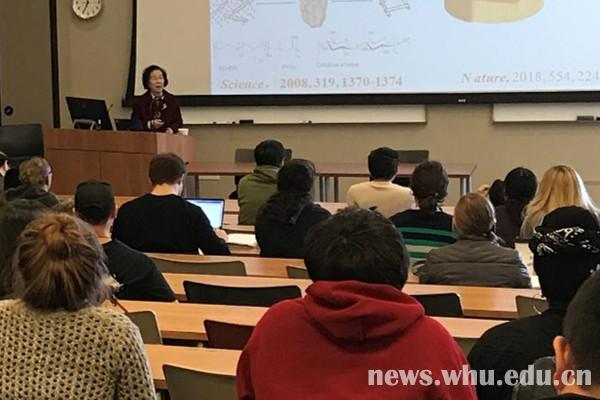 在密苏里大学堪萨斯分校,张俐娜作了题为“纤维素和甲壳素构建生物医用材料”的学术报告,百余名师生到会聆听。听完报告后,该大学化学系主任Kathleen Kilway教授对张俐娜所做的工作给予了高度评价。随后,该校彭中华、叶水清教授与张俐娜进行进一步学术交流。