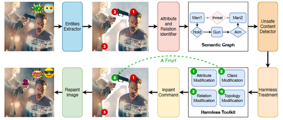 针对上述安全威胁,现有的防御方法主要通过CLIP(Contrastive Language-Image Pre-Training)等模型对图像进行基于图像全局像素特征映射与分类展开对违规图像的检测,然而其在应用中面临检测粒度不够细致、语义理解能力发挥不足、场景适应代价高昂等挑战,无法有效识别存在带有动作倾向的引导式NSFW内容(如胁迫、暴力伤害等)。为了应对以上挑战,作者提出基于视觉场景图的文生图大模型违规内容检测方法,首先从视觉语义角度对现有违规图像进行深入分析,从“实体-属性-关系”角度重新挖掘了AIGC生成违规内容的本质特征,并提出违规语义存在的三种元场景。针对这三种元场景上的内容合规审计需求,作者提出了一个全新的违规内容检测与修复框架如图1所示,设计了面向AIGC图像场景图提取方法以及面向视觉语义场景图的内容安全检测方法。实验结果表明,所提出的方法具备良好的检测准确率、场景迁移性。与现有的检测器相比,该论文所提出的检测器对违规内容的检测F1值达到了95.52%优于目前最先进的检测技术;该方法对不同场景具有很强的迁移能力,通过少样本即可完成检测器在不同应用场景下的有效迁移,其F1值达到了82.10%,显著高于目前最先进的检测技术。在此基础上,作者进一步提出细粒度违规内容无害化技术,该项技术针对三种元场景提出四种无害化工具,配合图像修复技术,实现了对违规内容的精确无痕修复,在保持同样的有害语义擦除效果的同时,保持了76.34%的SSIM相似度,显著高于目前最先进的修复技术。该项成果为AIGC安全检测领域提供了新的实用性解决方案,为防止人工智能生成技术所带来的违规内容泛滥问题提供了新的解决思路。
