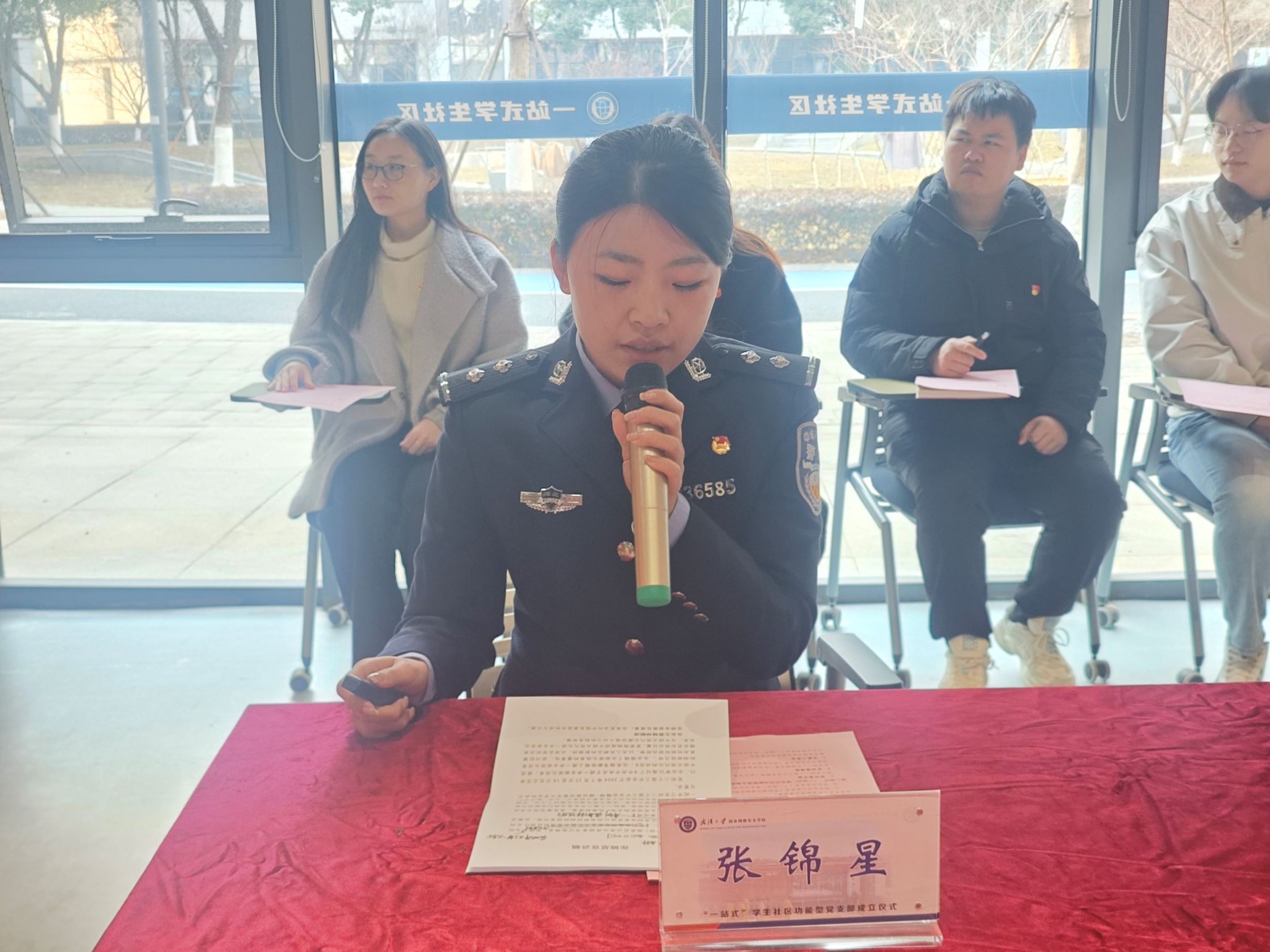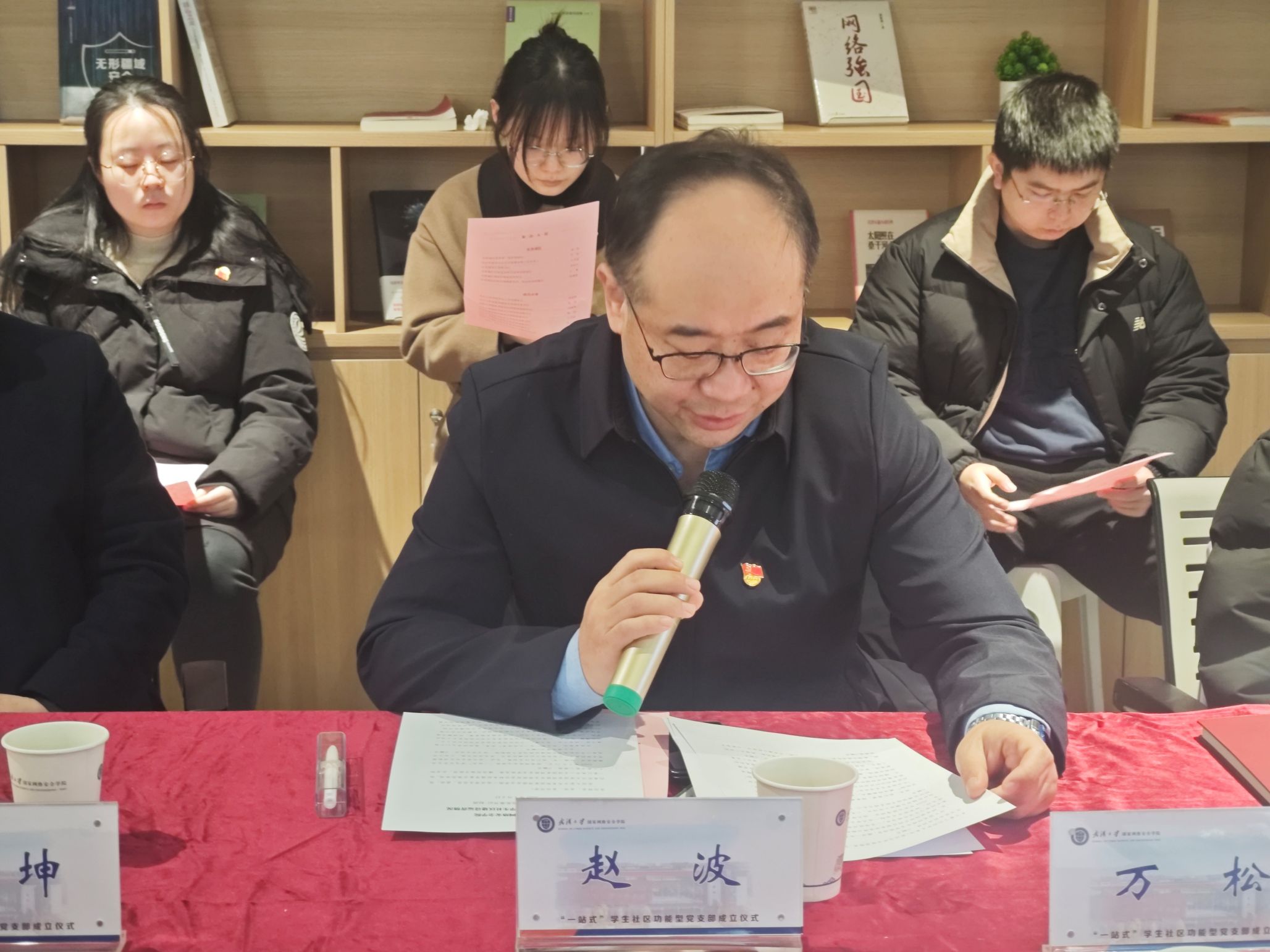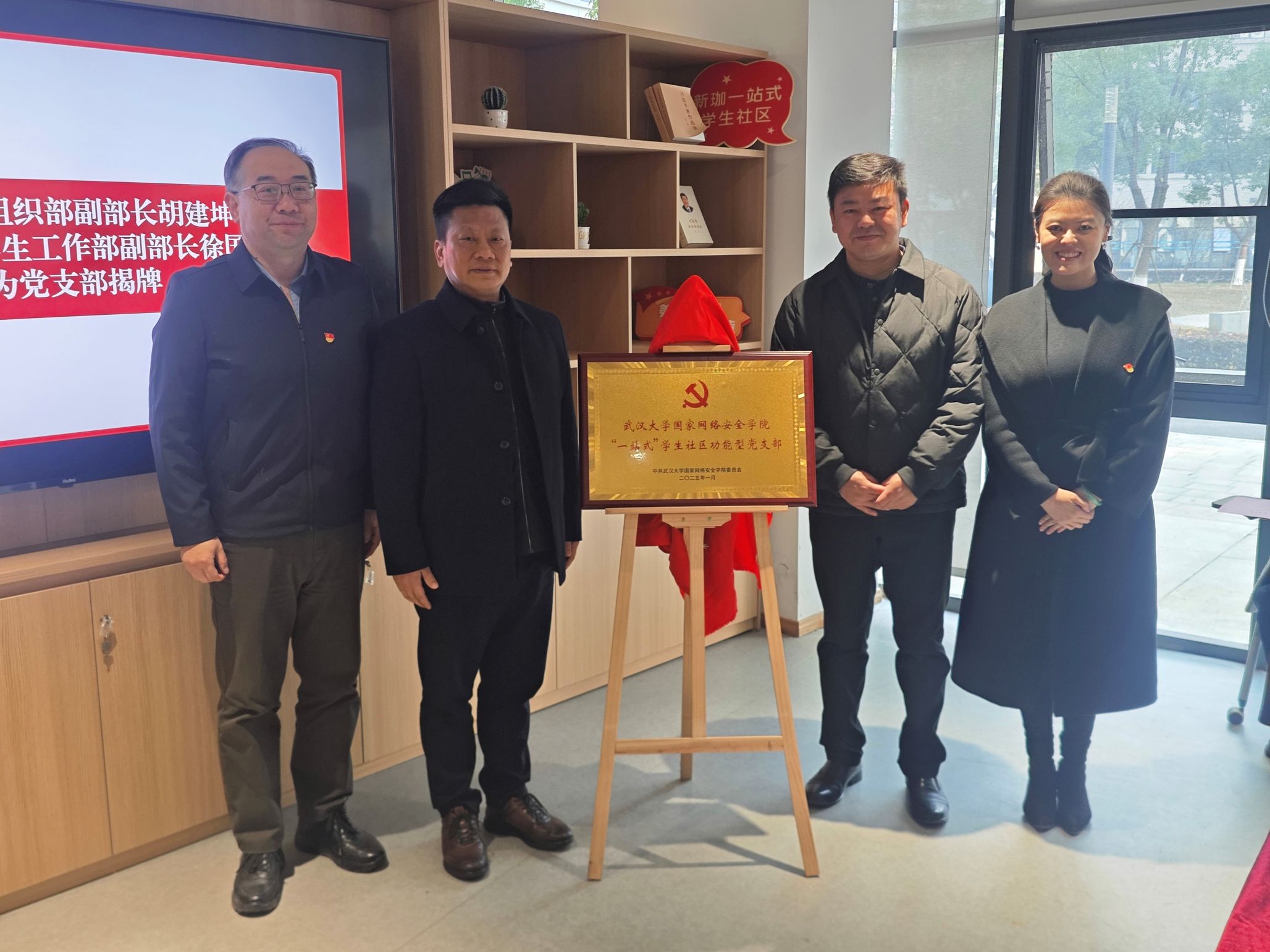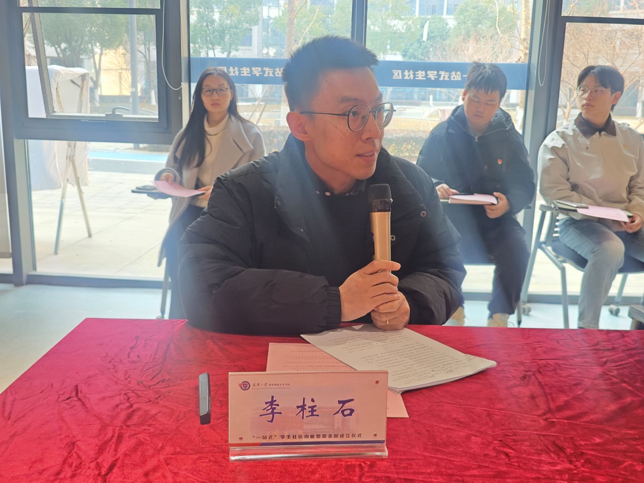 “一站式”学生社区功能型党支部的批复》及同意任命文件。东西湖区组织部副部长胡建坤,校党委学生工作部副部长徐国章共同为“一站式”学生社区功能型党支部揭牌。