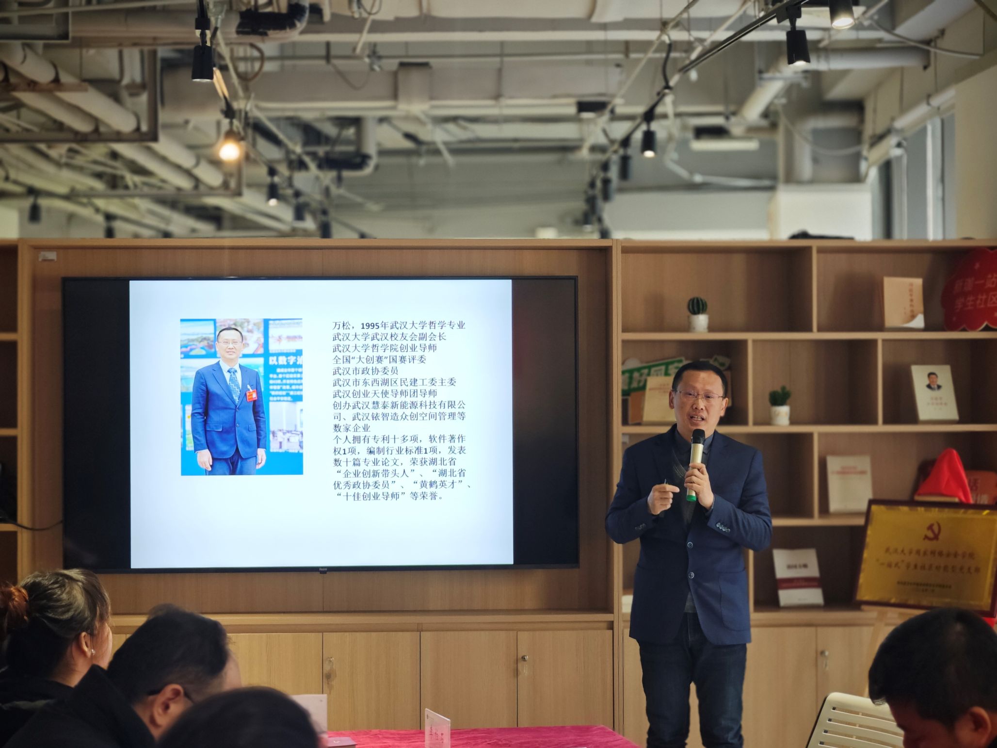 武汉市创业天使导师、武汉铱智造众创空间管理有限公司负责人万松分享创业经验。他结合自己的丰富的创业经历,勉励同学们通过持续学习、学会合作、思维创新时刻保持对新知识、新技术的敏感度和好奇心,并且表示非常期待日后可以参与到学院的创新创业比赛的指导中,为同学们提供资源和平台。