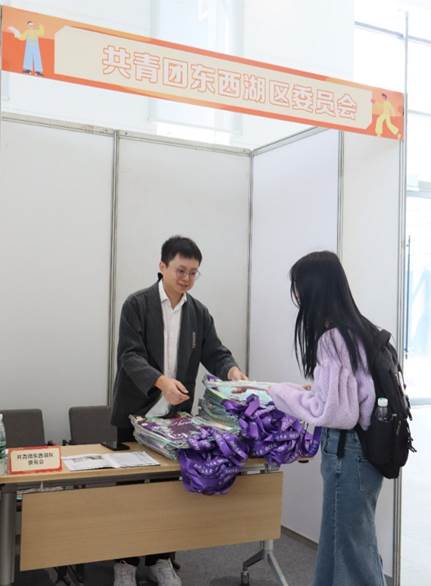 招聘会现场,共青团东西湖区委员会贴心为每一位参会同学准备了精心制作的礼包,为同学们的现场求职提供便利。
